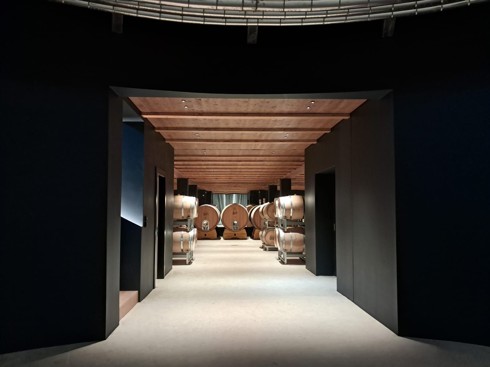 La realizzazione finale si sviluppa su tre livelli funzionali: il piano interrato è dedicato all’appassimento e all’invecchiamento dei vini, il piano terreno ospita la pigiatura e gli uffici, mentre il primo piano accoglie una sala degustazione panoramica con un’ampia terrazza affacciata sui vigneti.