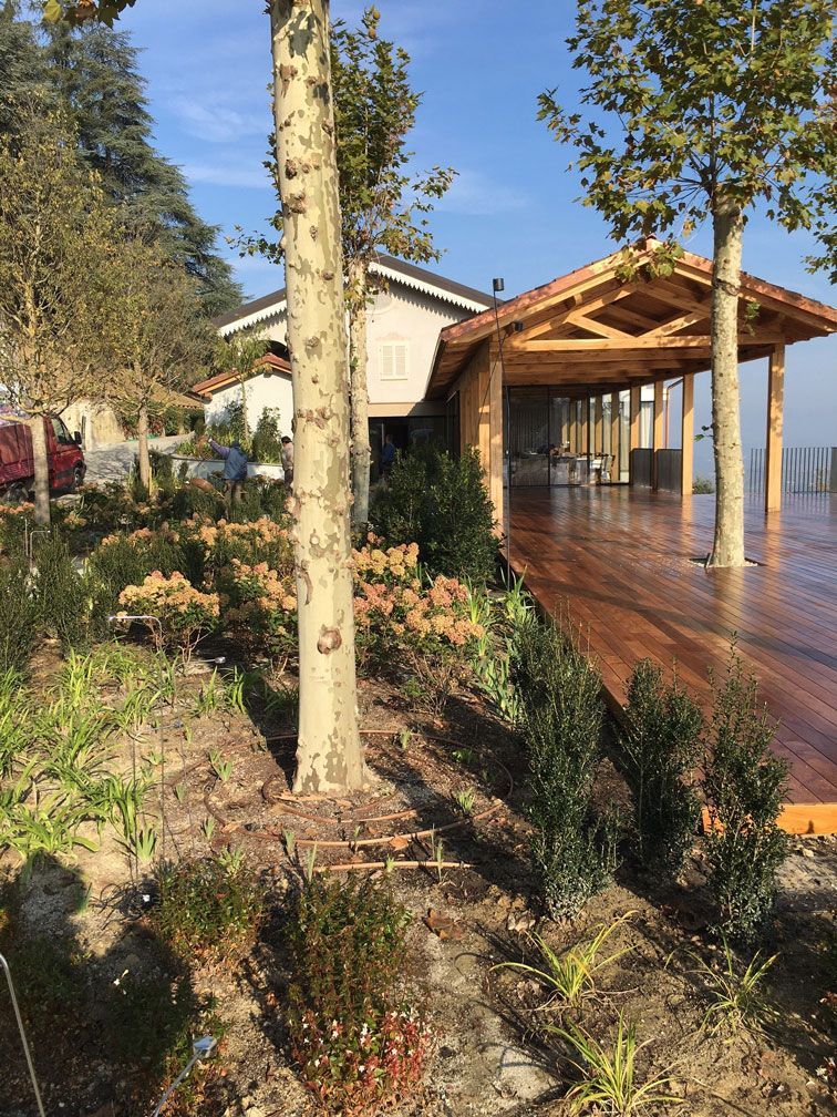 un nuovo giardino con alberi ad alto fusto e un dehors pavimentato in legno. È stato realizzato un nuovo